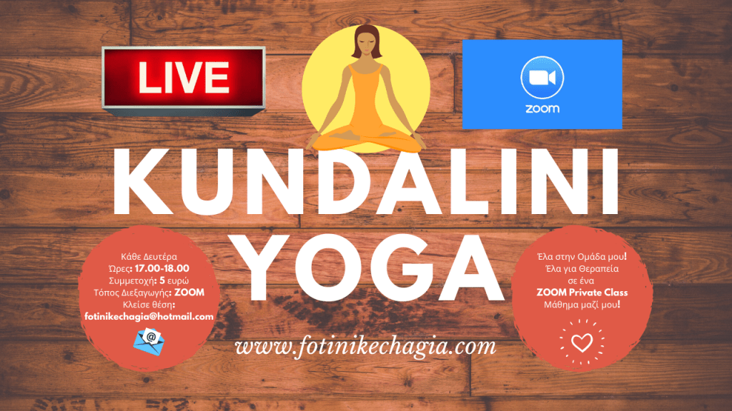 Αν θέλετε να δοκιμάσετε την Κουνταλίνι Γιόγκα, κάθε Δευτέρα, 17:00-18:00, κάνω Μάθημα στο ZOOM, σε ένα Ιδιαίτερο Live Μάθημα, με συμβολική συμμετοχή στα 5 ευρώ το Μάθημα! Αν θέλετε να μπείτε στην ομάδα μου και να κάνουμε μαζί, κάθε Δευτέρα Κουνταλίνι Γιόγκα, αγοράστε το εισιτήριο σας εδώ κι έπειτα επικοινωνήστε μαζί μου, για να το επιβεβαιώσω και να σας εντάξω στην Ομάδα!