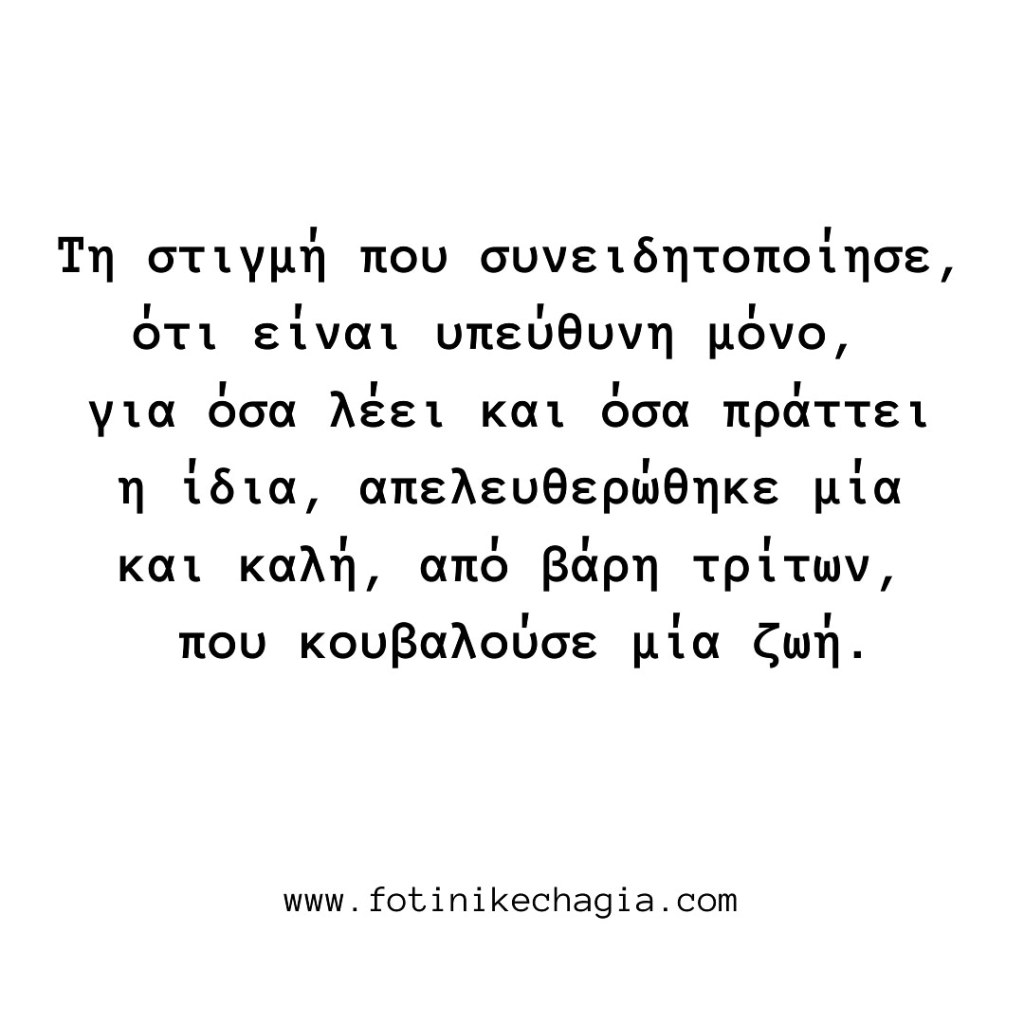 Ελεύθεροι είμαστε μόνο, όταν συνειδητοποιούμε ότι είμαστε υπεύθυνοι, για τα λόγια που εμείς είπαμε και τις πράξεις που εμείς πράξαμε και όχι οι άλλοι. Όμορφη μέρα μες στην ελευθερία! 🌺