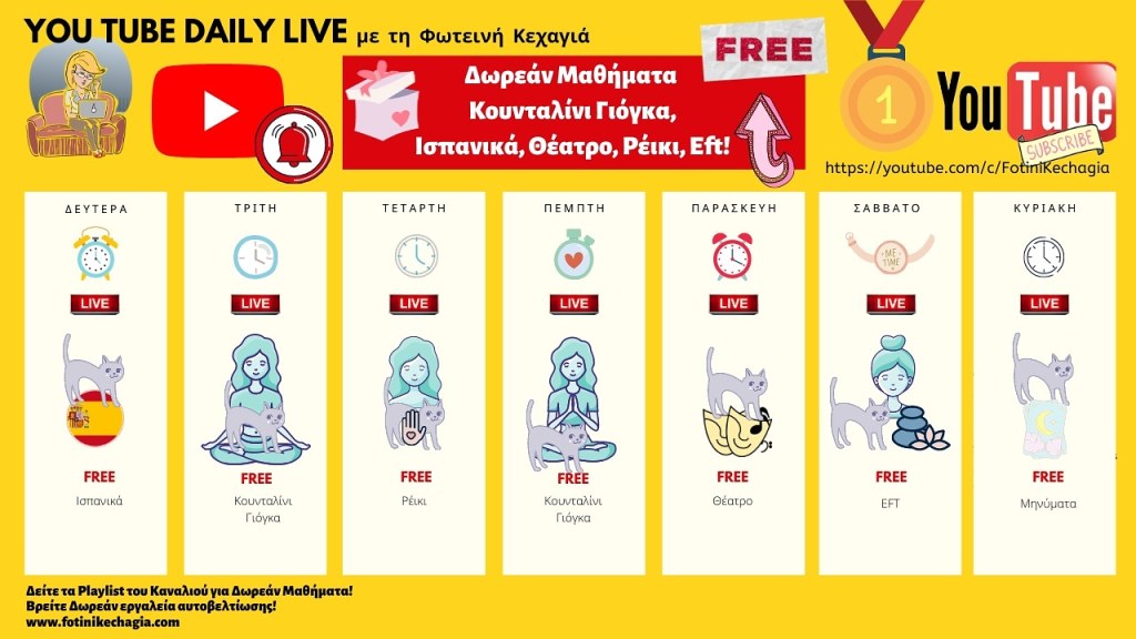Κάθε μέρα το μάθημα ξεκινάει στις 4:00 το απόγευμα! Το live είναι τριπλό, γίνεται στο προφίλ μου στο instagram, στο κανάλι μου στο YouTube και στη σελίδα μου στο facebook Κίνηση Αγγέλων στη γη και είναι δωρεάν!