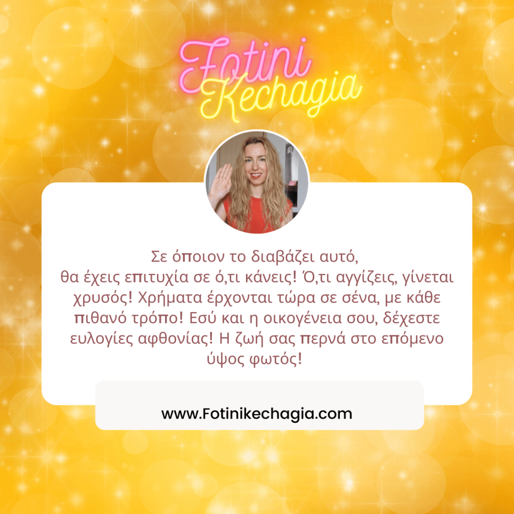 Σε όποιον το διαβάζει αυτό, θα έχεις επιτυχία σε ό,τι κάνεις! Ό,τι αγγίζεις, γίνεται χρυσός! Χρήματα έρχονται τώρα σε σένα, με κάθε πιθανό τρόπο! Εσύ και η οικογένεια σου, δέχεστε ευλογίες αφθονίας! Η ζωή σας περνά στο επόμενο ύψος φωτός! 🙏